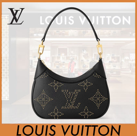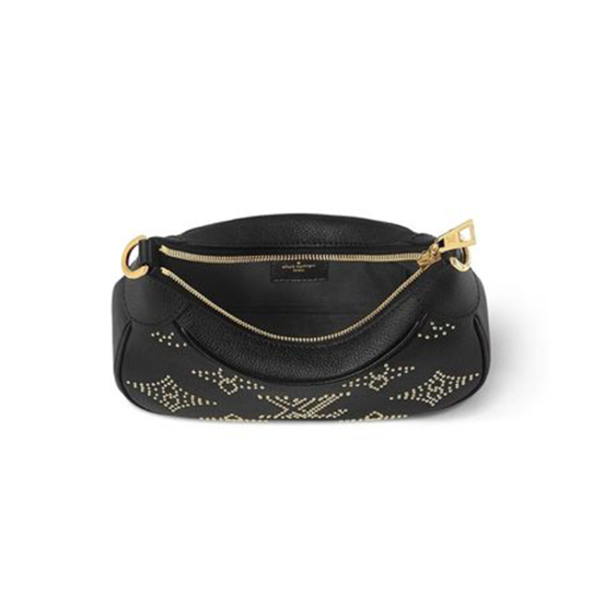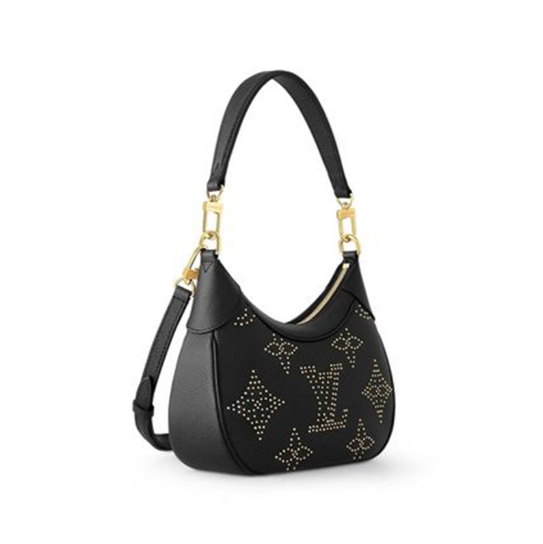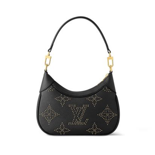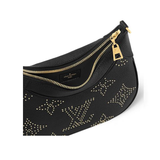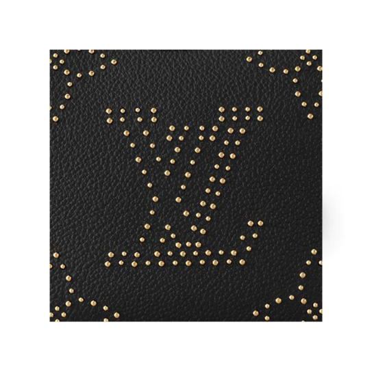 このロックシックなバガテルハンドバッグはモノグラムアンプラントレザーで作られており ゴールドカラーのスタッズが象徴的なモノグラムパターンを形成しています。