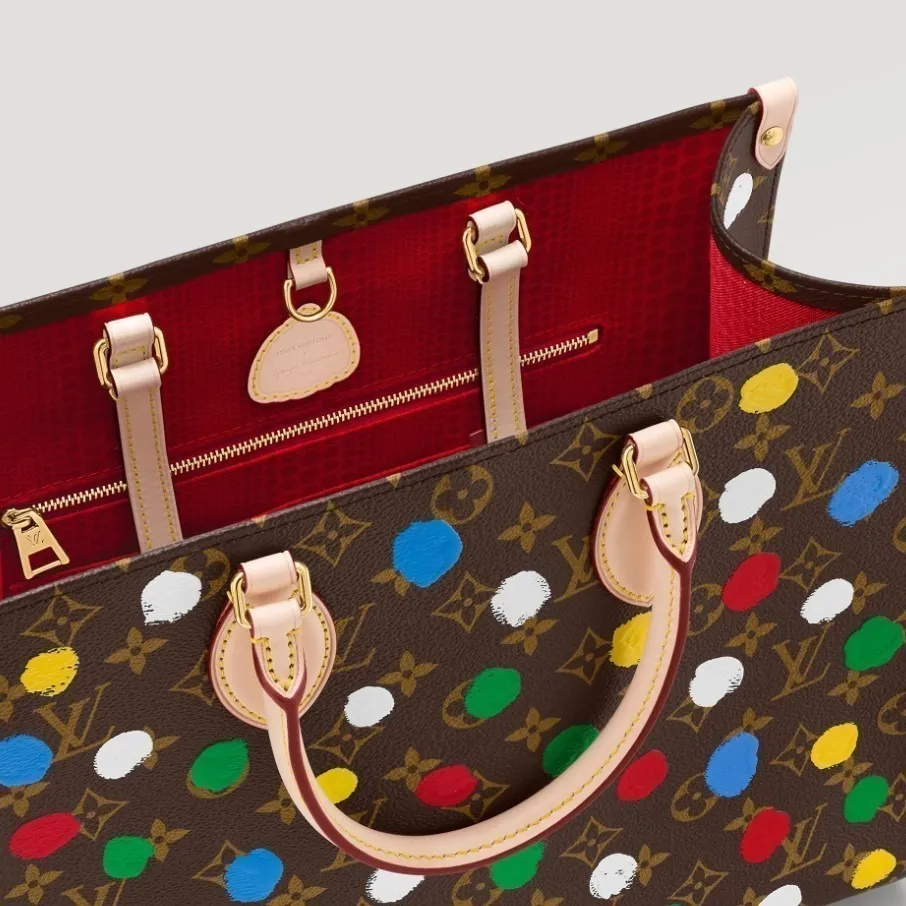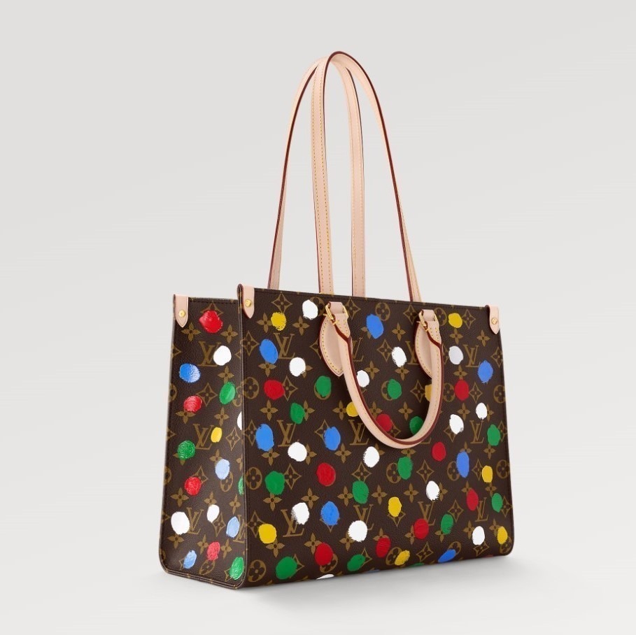 ルイ・ヴィトン x 草間彌生の主要な新しいコラボレーションの一環として LVxYK OnTheGo MM は著名な日本人アーティストの署名ドットに基づいた人目を引くプリントが特徴です。モノグラム キャンバスは 10年前にメゾンとの最初のコラボレーションの後 草間が描いたトランクから丹念に再現されたマルチカラーのドットで飾られています。