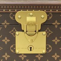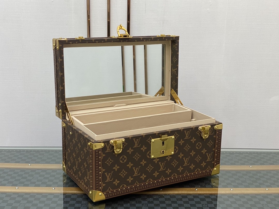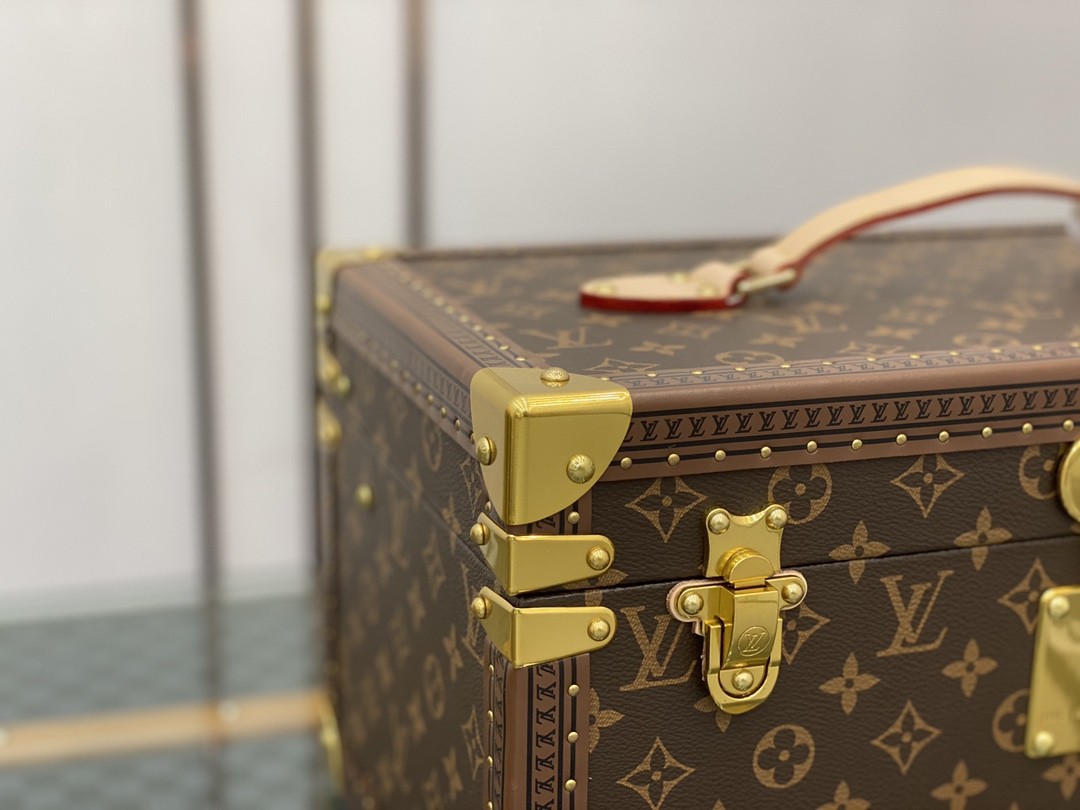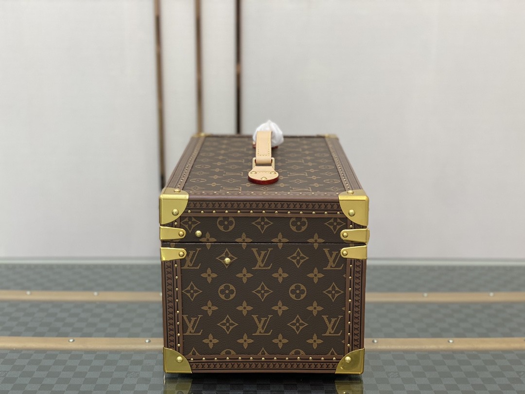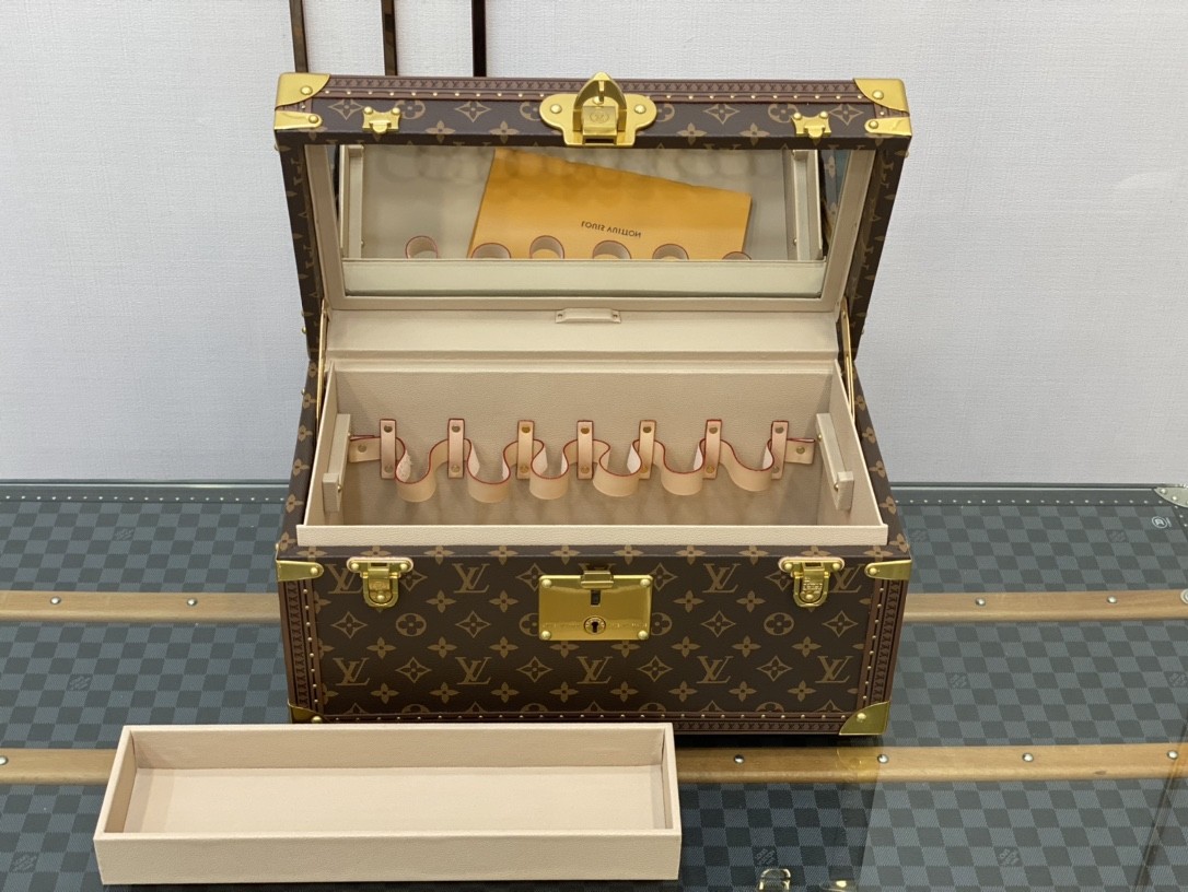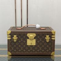 この化粧箱は定番のMonogramキャンバス素材を採用し、天然牛革のハンドルと金色の金属部品を備えている。化粧箱の蓋の内側には鏡があり、内部には14本のボトルカバーがあり、旅行用に適しています。